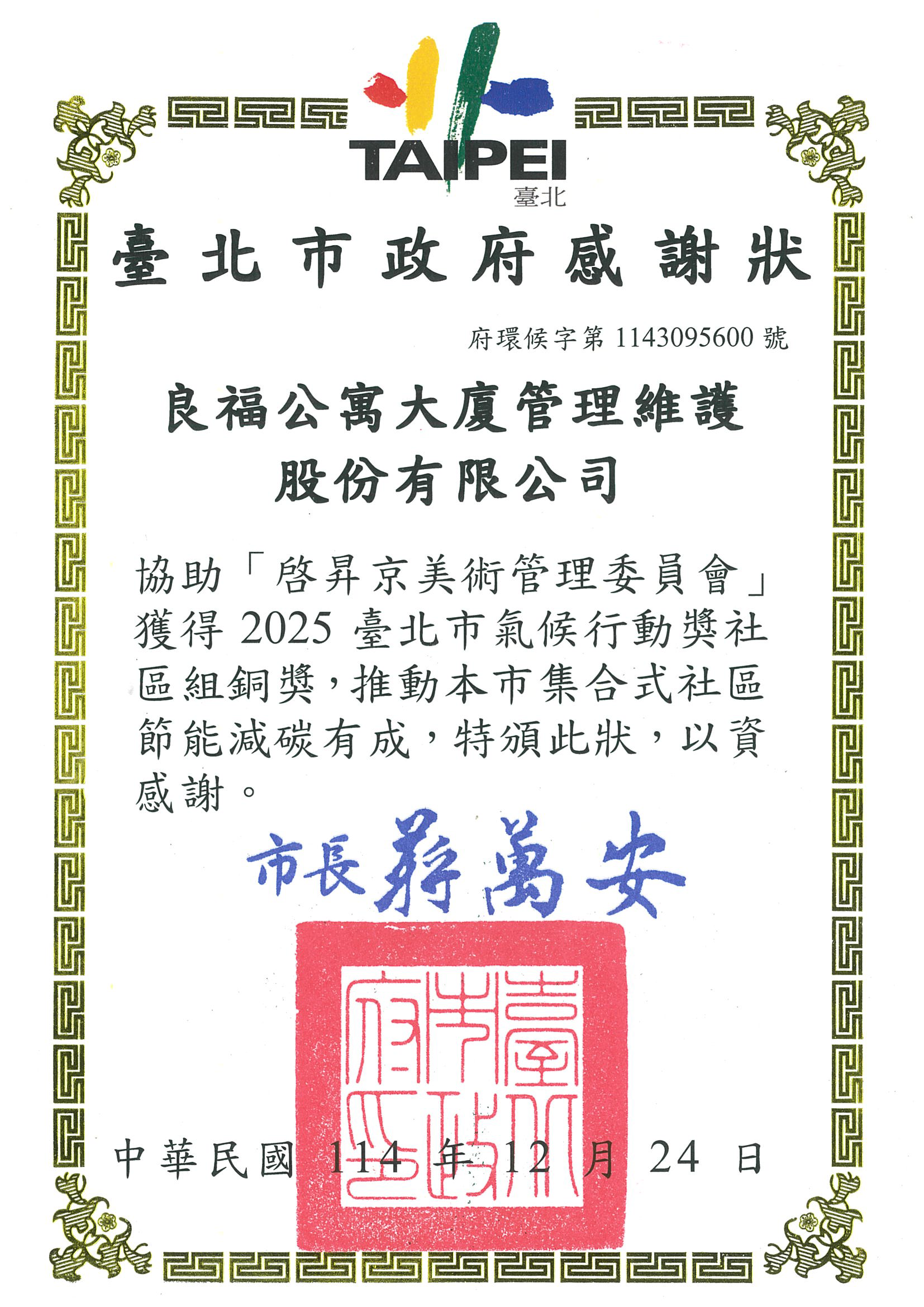 由臺北市政府主辦的 臺北市氣候行動獎,旨在表揚積極投入節能減碳、落實低碳生活與推動永續發展的優良社區與單位。在最新一屆評選中,由 良福物業 專業管理與服務的「啓昇京美術」社區,憑藉具體且持續推動的氣候行動成果,榮獲 社區組銅獎 肯定,展現社區在永續治理上的實質成效。